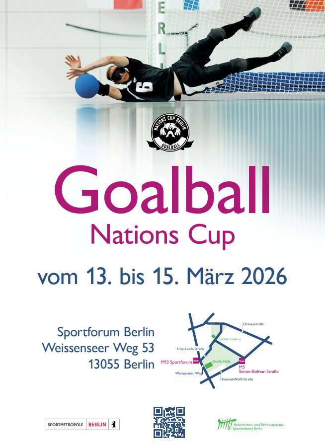 Der Goalball Nations Cup 2026 findet vom 13. bis 15. März 2026 im Sportforum Berlin (Weißenseer Weg 53, 13055 Berlin) statt. Der Spielplan wird zeitnah auf der Veranstaltungswebsite www.gbnc-berlin.de und auf Instagram veröffentlicht.