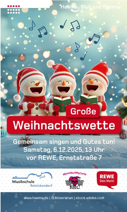 Helft uns, 50 Menschen (oder mehr!) zu versammeln, um gemeinsam Weihnachtslieder zu singen! Wenn wir es schaffen, spendet REWE Ernststraße 500 Euro für einen guten Zweck – unterstützt vom „Bunten Blech“, den Trompeter*innen der Musikschule Reinickendorf unter der Leitung von Gisela Meßollen. Kommt vorbei, singt mit uns und genießt ein besinnliches, vorweihnachtliches Beisammensein – mit Glühwein als Dankeschön für alle Sänger*innen.